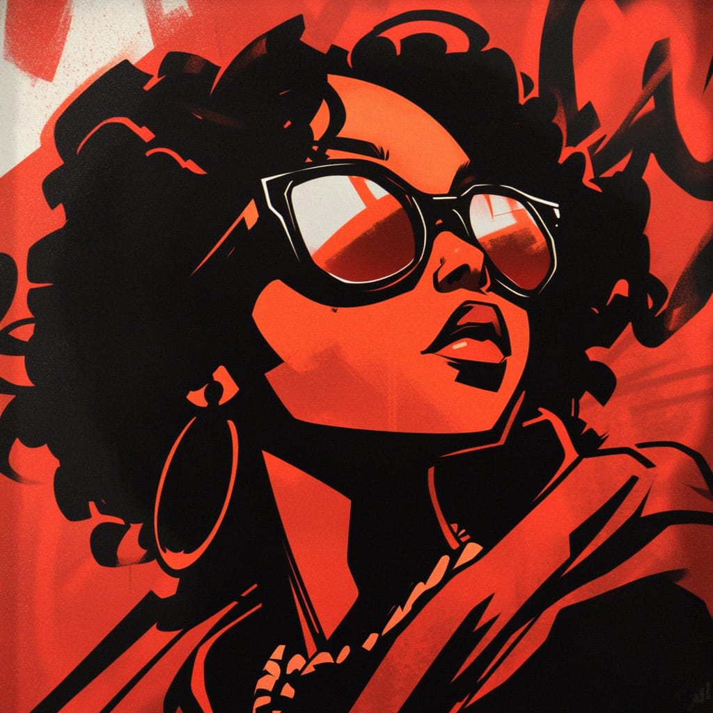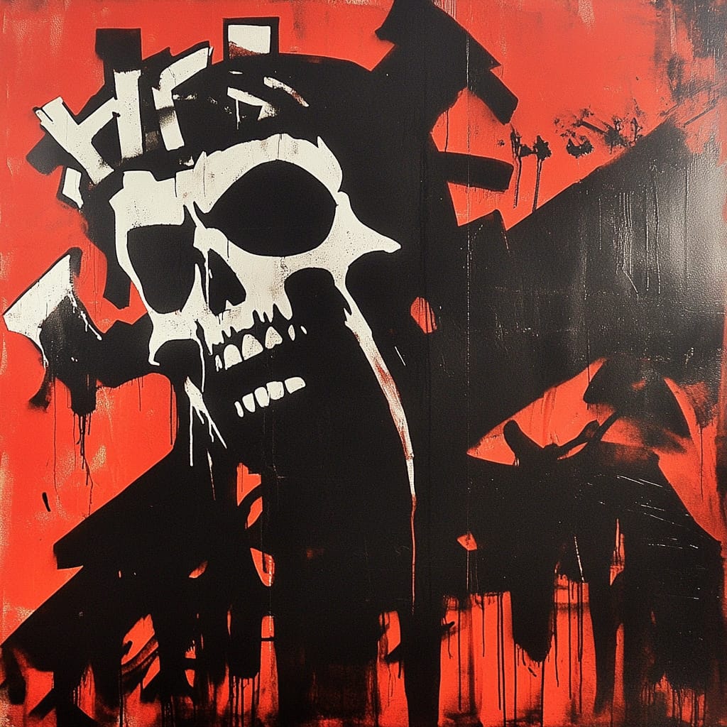呈现出一种街头艺术与表现主义相结合的画风,强烈的黑红对比贯穿始终,既展现了视觉冲击力,又传递出一种叛逆与戏剧性的氛围。作品以剪影风格和粗糙的喷绘效果为主要表现手法,结合溅射感和抽象的纹理细节,使画面富有张力与情绪。人物和场景被简化为高对比度的形状,保留了关键特征,强化了叙事性与象征性。画面中的不规则边缘与涂鸦式文字元素呼应了街头文化的自由与无拘束,背景则常常通过扭曲或夸张的形式强化焦点。整体风格直接而生猛,表现了压迫、抗争或末世主题的情感表达,极具视觉吸引力和文化批判性。