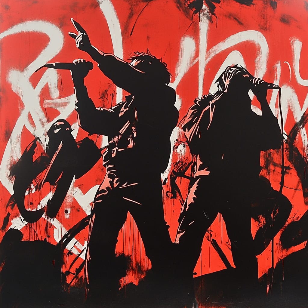 - Dynamic silhouettes of performers mid-action, layered with graffiti sprays and dramatic black-and-red contrasts; capturing the energy of live music --sref 427201542