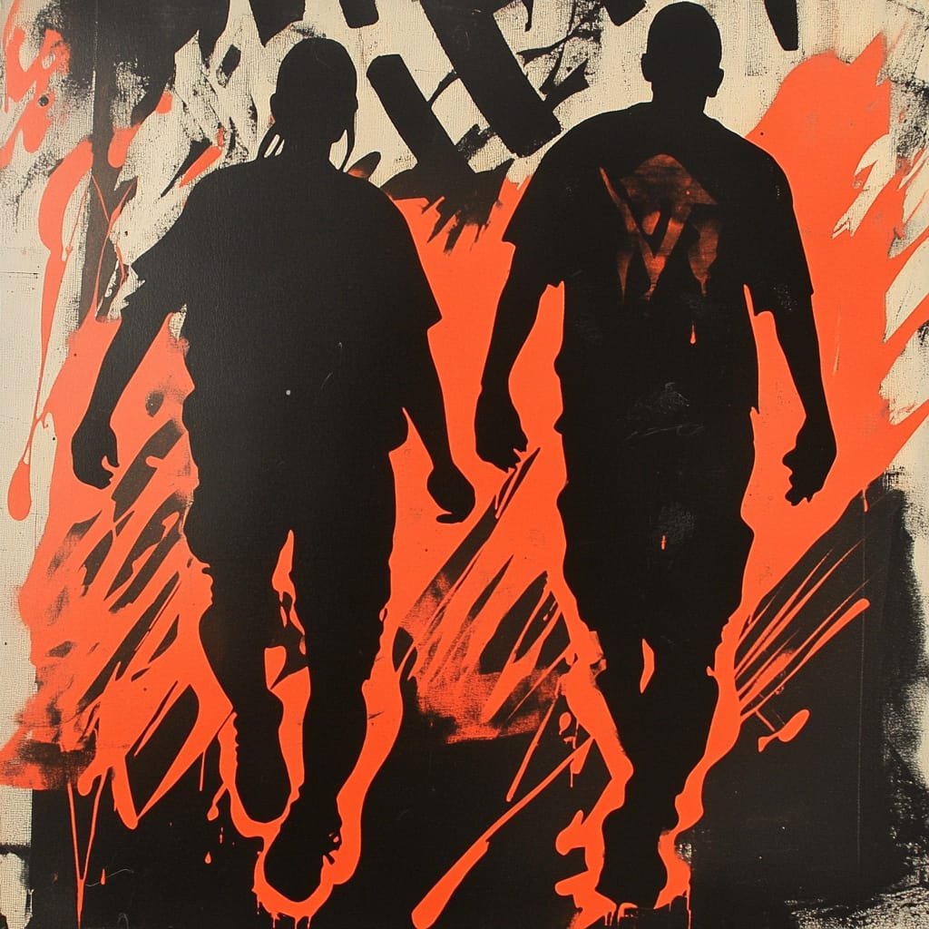 - Dynamic human figures in stencil-style with rough edges, layered graffiti patterns, and bold red accents; emphasizing freedom and counter-culture themes --sref 427201542