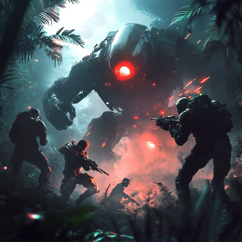 - A team of four cybernetic warriors coordinating an ambush on a glowing mech-beast in a dense neon-lit jungle. One leaps from the trees, another positions a sniper rifle, while the others strategize through holographic displays glowing amidst the mist --sref 317430154 --stylize 200