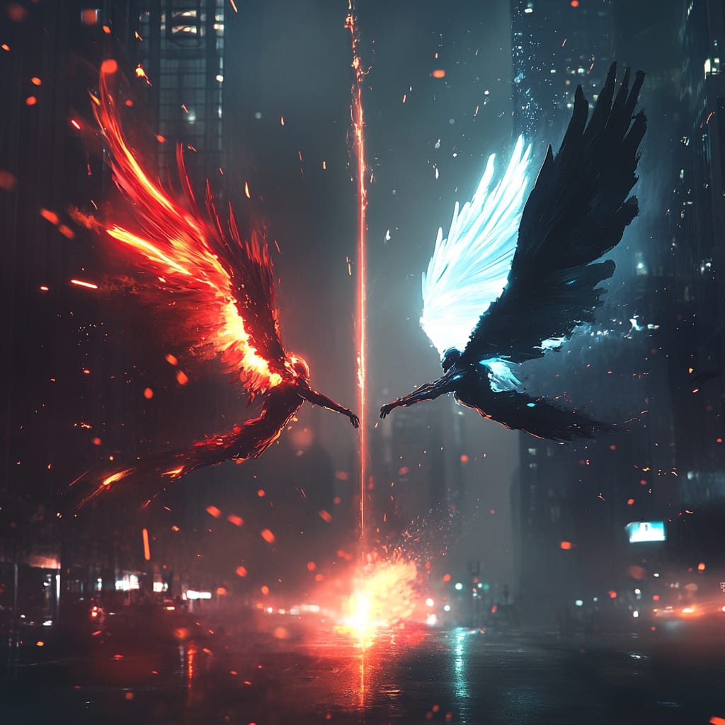 - A surreal scene of two humanoid figures with glowing wings, one radiant red and the other icy blue, locked in a spiraling aerial combat above a dystopian cityscape, trails of energy and embers marking their paths, surreal and dynamic composition --sref 317430154 --stylize 200