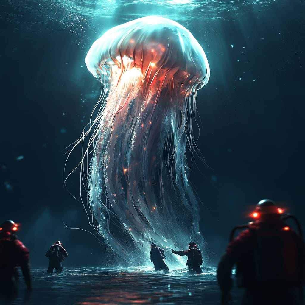 - A serene ocean where bioluminescent jellyfish float above the surface, glowing faintly in the moonlight. A group of explorers in illuminated diving suits interact with a massive, translucent sea creature rising from the depths, its tendrils radiating ethereal light --sref 317430154 --stylize 200