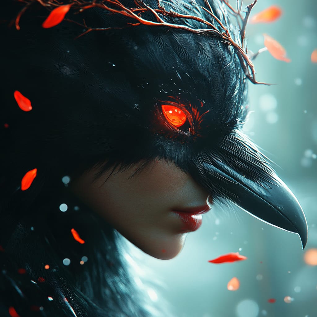 - A surreal bird-human hybrid, with half a human face seamlessly blending into a raven’s beak and feathers, glowing crimson eye on the bird side, surrounded by twigs with red petals, against a misty, ethereal background --sref 317430154 --stylize 500
