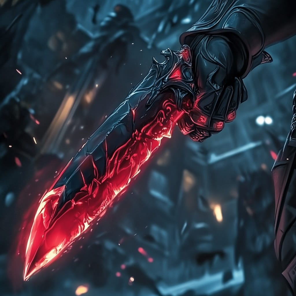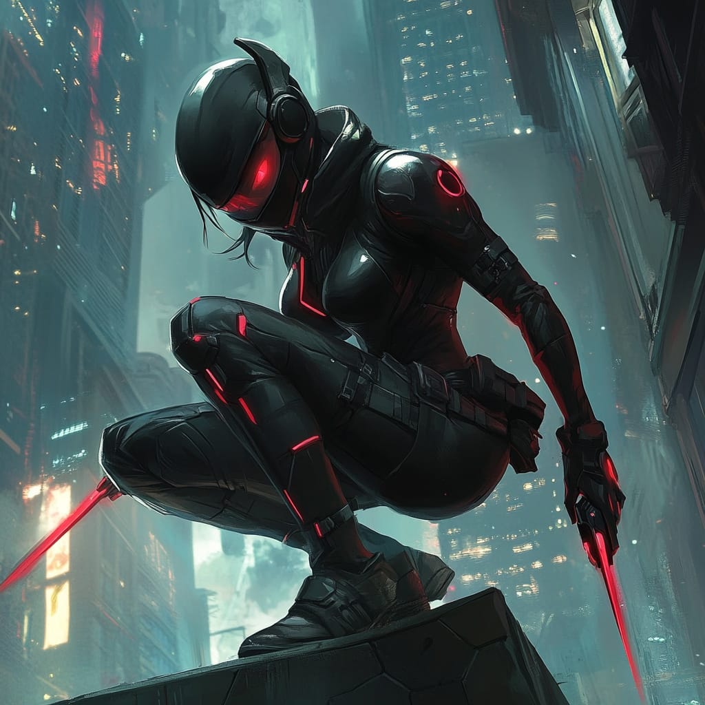 - A cyberpunk assassin clad in sleek, black body armor with glowing red circuits. They crouch on a ledge, holding dual energy blades, with the neon skyline reflecting off their visor as they prepare to leap --sref 936035022 --v 6.1 --stylize 200