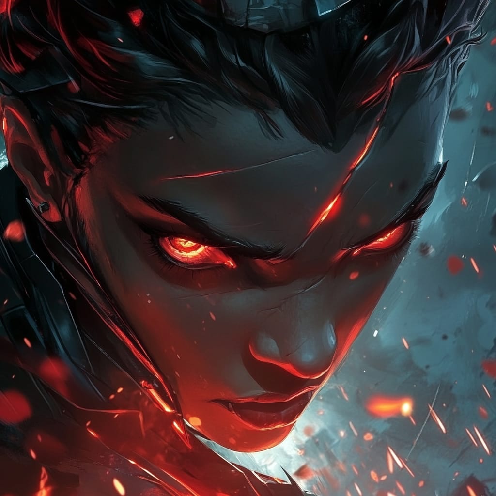 - A close-up of a character’s face, featuring a glowing red cybernetic eye and a partially metallic jaw. The reflection of a neon cityscape dances across their exposed skin --sref 936035022 --v 6.1 --stylize 200