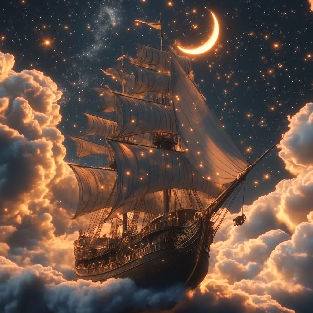 - Ethereal galleon sailing across a star-swept sky like a celestial ocean, golden sails billowing with cosmic wind, a young captain at the helm gazing up at a rising crescent moon, constellations forming mythical creatures in the swirling clouds --sref 359028397 --stylize 200