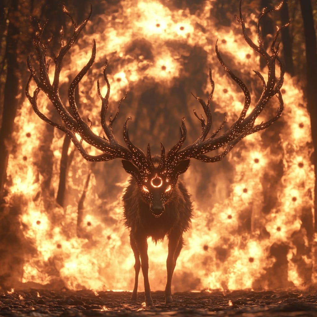 - a beast made of stitched shadows and antlers rising from a ring of fire, dozens of mirrored eyes blinking in slow sequence, each step melting symbols into the ground it walks on --sref 359028397 --stylize 200