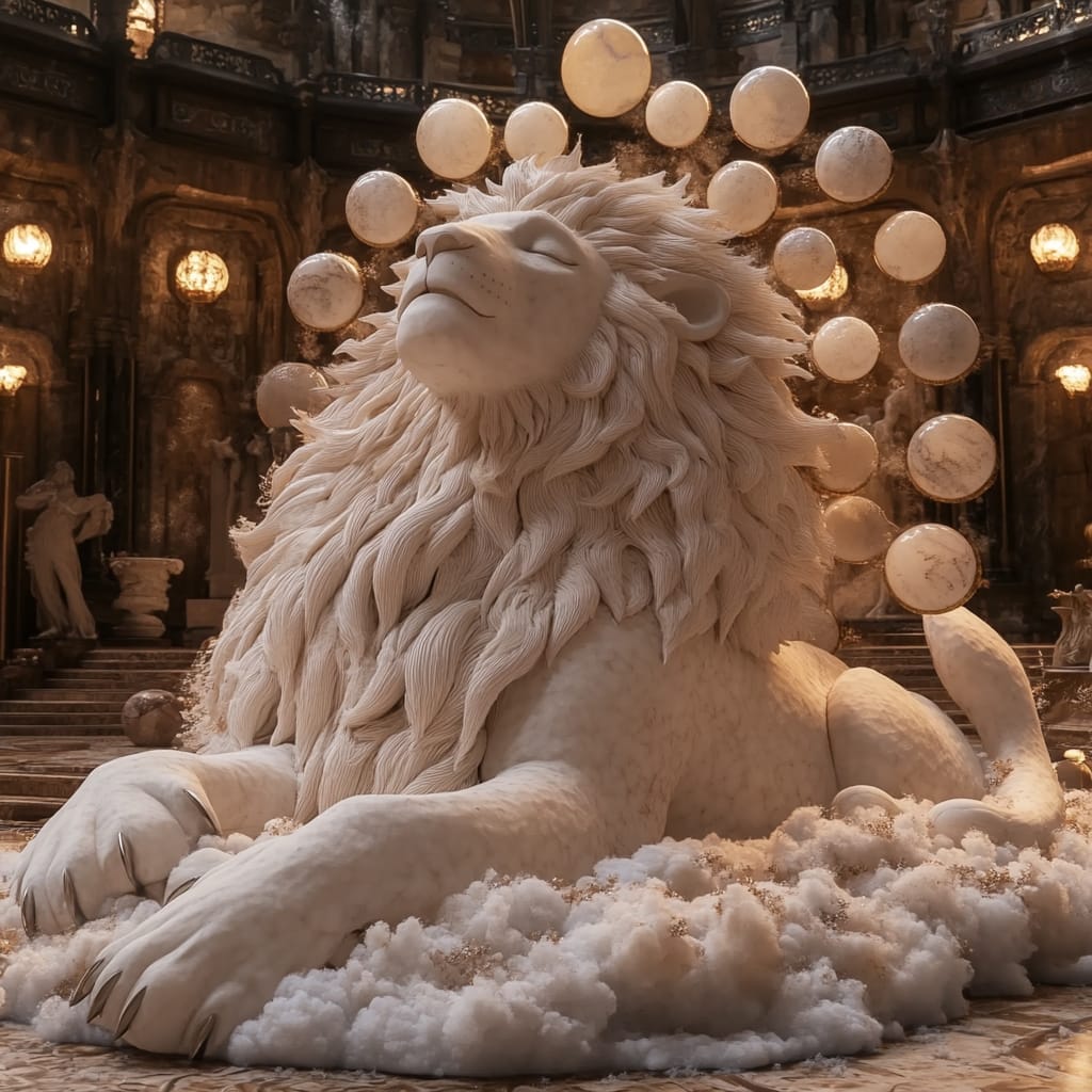 - a kinetic sculpture of moons orbiting a sleeping lion made of quartz, its mane shifting color as viewers approach, the air around it filled with scents from unseen seasons, each step triggering soft chimes buried in the floor --sref 359028397 --stylize 200