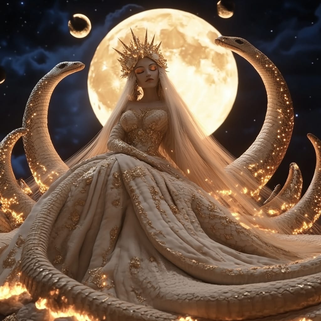 - a serpent queen coiled on a throne of mirrors, her tongue a golden ribbon inscribed with shifting prophecies, crowns made of frozen flame orbiting her head, each scale holding a different moon --sref 359028397 --stylize 200