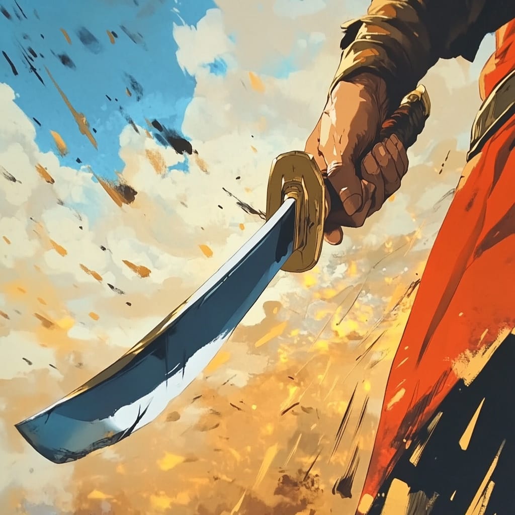 - close-up on hand tightening grip on blade as wind stirs cloak --sref 490772078 --stylize 200