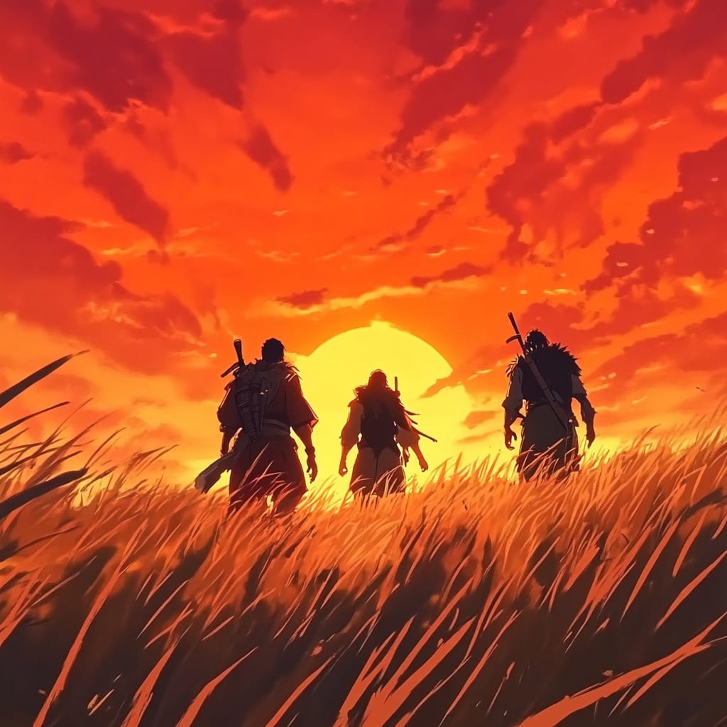 - three travelers walking through a field of tall grass under an orange sky --sref 490772078 --stylize 200