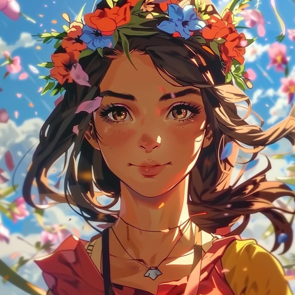 - A girl with a floral crown on her head, her hair flowing softly in the wind, with a serene expression. The background is filled with soft pastel flowers in a cartoonish, whimsical style --sref 490772078 --stylize 200