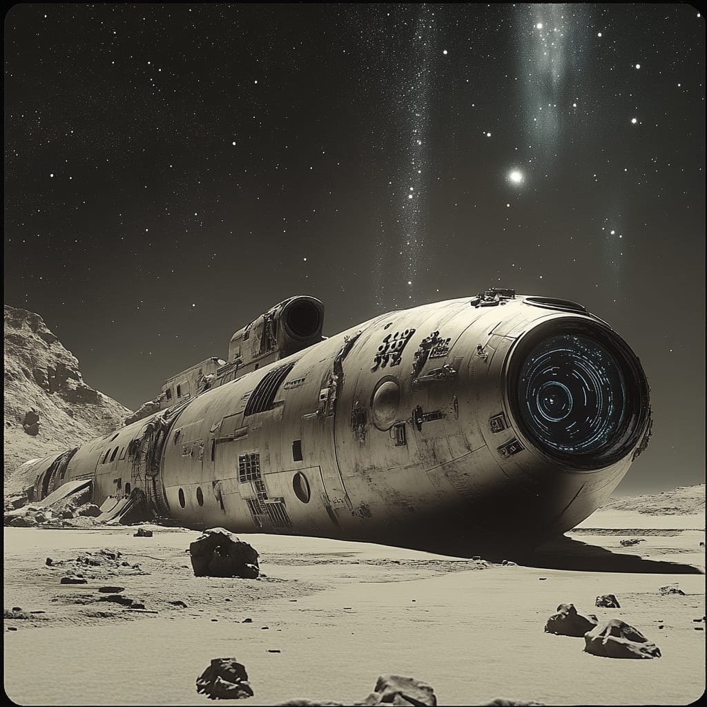 - An ancient, colossal spaceship partially buried in a desolate, alien desert. The surface of the ship is weathered, covered in intricate mechanical engravings and glowing blue runes. The sky above swirls with distant galaxies and faint auroras, creating a blend of mystery, wonder, and advanced technology --sref 453281329 --stylize 200