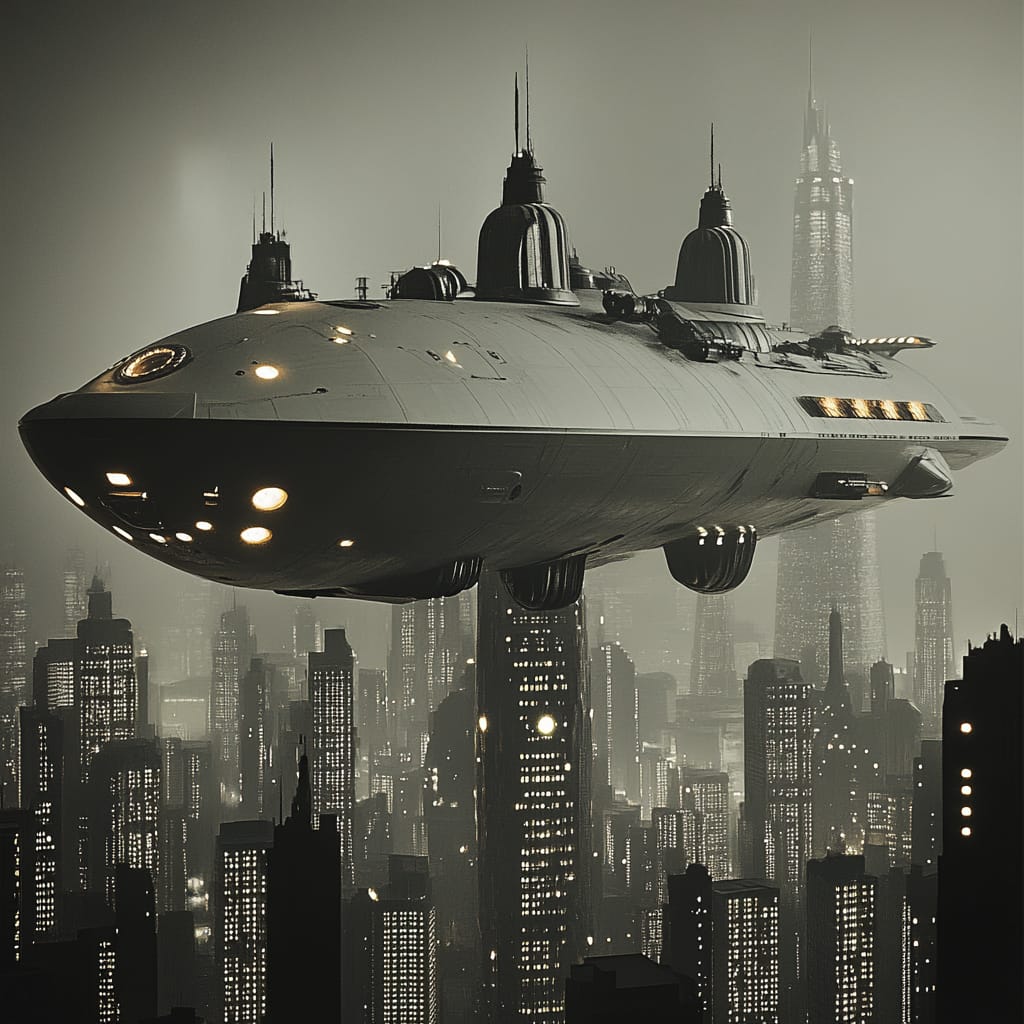 - A massive industrial spaceship hovering above a sprawling futuristic city, its underbelly covered in glowing panels and mechanical details. Below, the skyline is dominated by colossal skyscrapers with reflective surfaces, illuminated windows, and drifting mist. --sref 453281329 --stylize 200