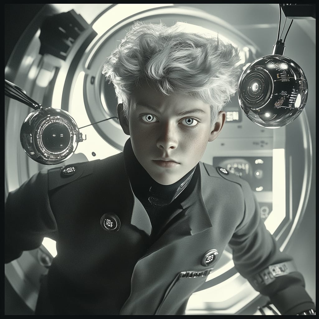 - A teenage scientist with sharp, curious eyes and messy silver hair, wearing a futuristic lab coat laced with holographic patterns. Floating around him are glowing data screens and levitating tools, while a sleek mechanical assistant hovers at his side. Behind him, a massive energy reactor emits soft pulsating light, casting a dynamic glow onto his focused expression --sref 453281329 --stylize 200