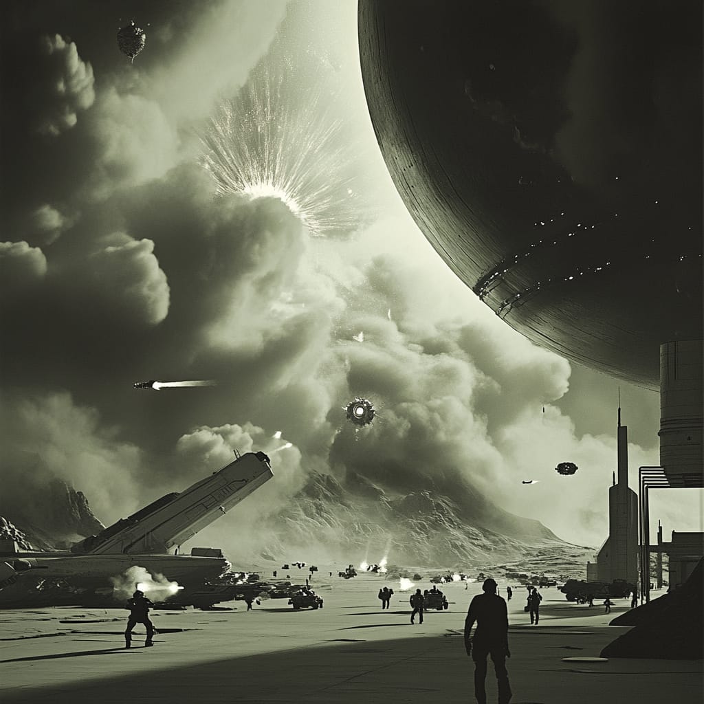 - A massive interdimensional rift floating above a sprawling futuristic battlefield. Shards of glowing, crystalline energy surround the rift, while advanced military vehicles and mech units clash below. The sky is fractured with swirling energy storms and faint glimpses of otherworldly landscapes bleeding through the rift --sref 453281329 --stylize 200