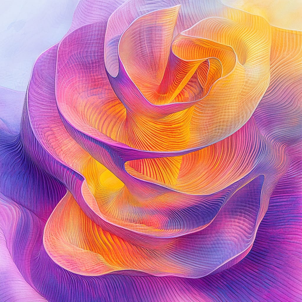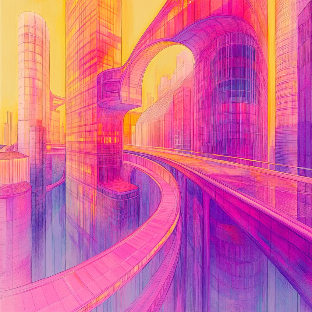 展现了表现主义与幻想风格,以高饱和暖色调(橙、紫、黄)为主,通过色彩对比与渐变增强画面的空间层次和情绪张力。夸张的透视手法,如俯视、仰视和极近特写,赋予画面强烈的戏剧性。线条运用精细且富表现力,密集的交叠线条既塑造了细腻的纹理,又赋予画面动感与韵律感,特别是在建筑中凸显了结构感和形式美。光影运用了明暗对比与光晕效果,强化了画面中心的视觉吸引力,并渲染出超现实氛围。整体来看,作品通过对色彩、线条和光影的精准掌控,将抽象表现与具象叙事相结合,展现了高度的艺术张力与技术成熟度。