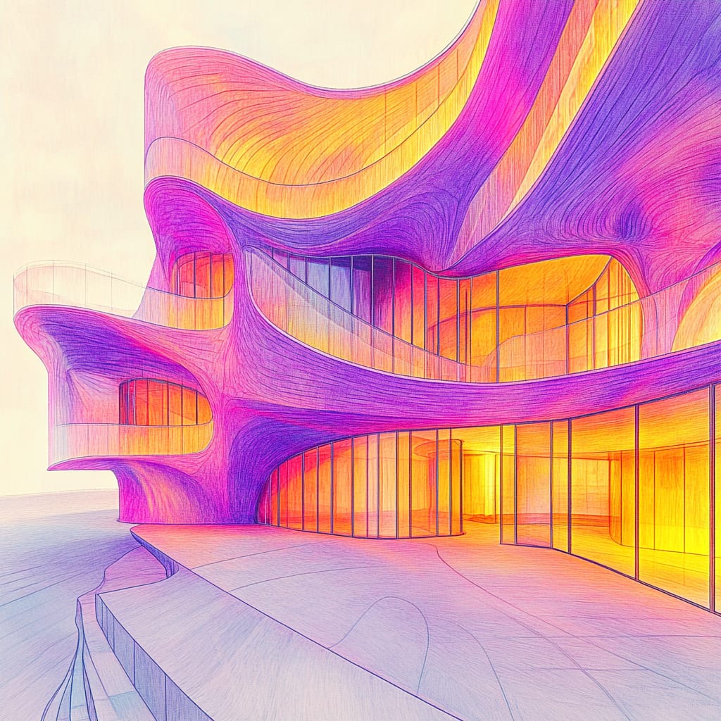 - Dynamic fluid architecture, seamless organic forms, radiant light trails integrated into structure, undulating wave-like facades, futuristic helix-inspired frameworks, glowing accents, soft and harmonious transitions between solid and void --sref 655345489 --v 6.1 --stylize 200