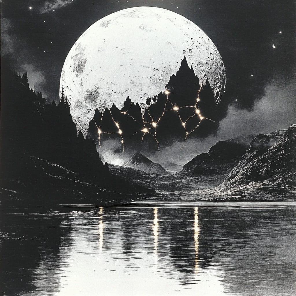 - A fractured moon hovering above a serene lake, with its pieces held together by glowing golden threads, symbolizing resilience and unity --sref 360690461 --stylize 200