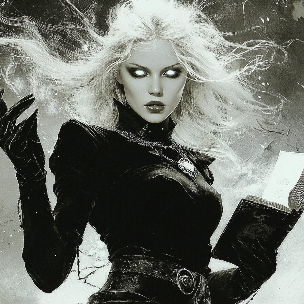 - A female sorceress with pale skin and glowing eyes, her hair flowing in the wind, surrounded by dark tendrils of energy and an ancient spellbook floating beside her --sref 360690461 --stylize 200