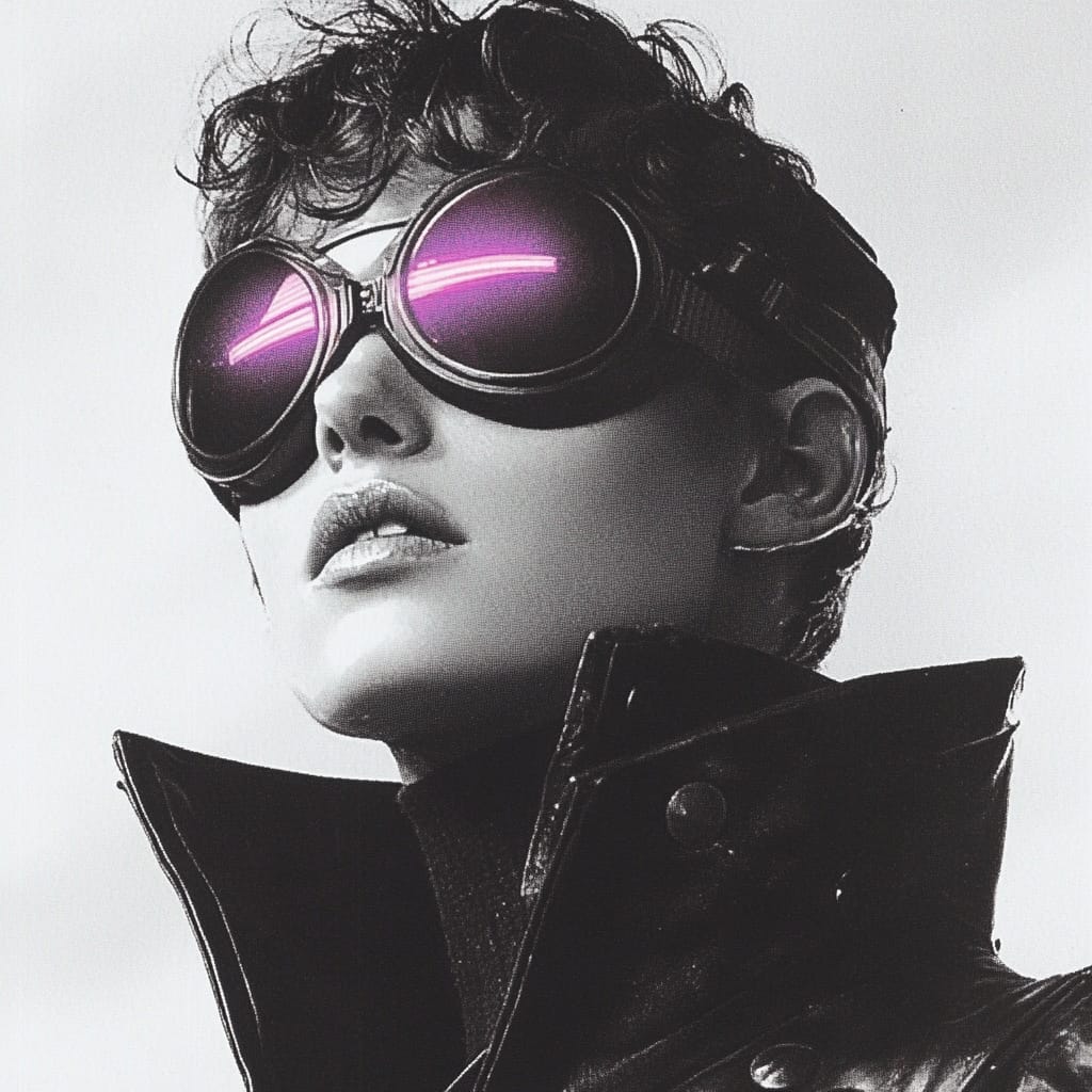 - A futuristic aviator with reflective goggles and a high-collared jacket, framed by geometric neon patterns and subtle metallic textures --sref 360690461 --stylize 200