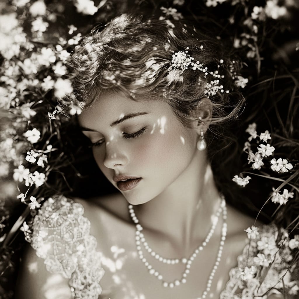 - editorial fantasy fashion, ethereal female model, enchanted fabric flow, delicate lace and pearls, mystical garden background, magical realism, high-end concept styling --sref 752314637 --stylize 200
