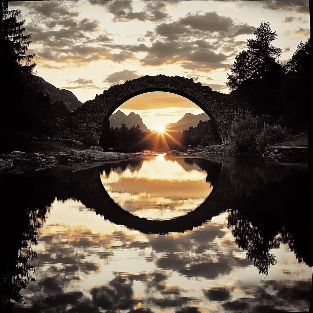 - bridge between worlds at sunset, two skies colliding, mirror lake reflecting another reality,cinematic widescreen shot, soft chaos in air --sref 752314637 --stylize 200