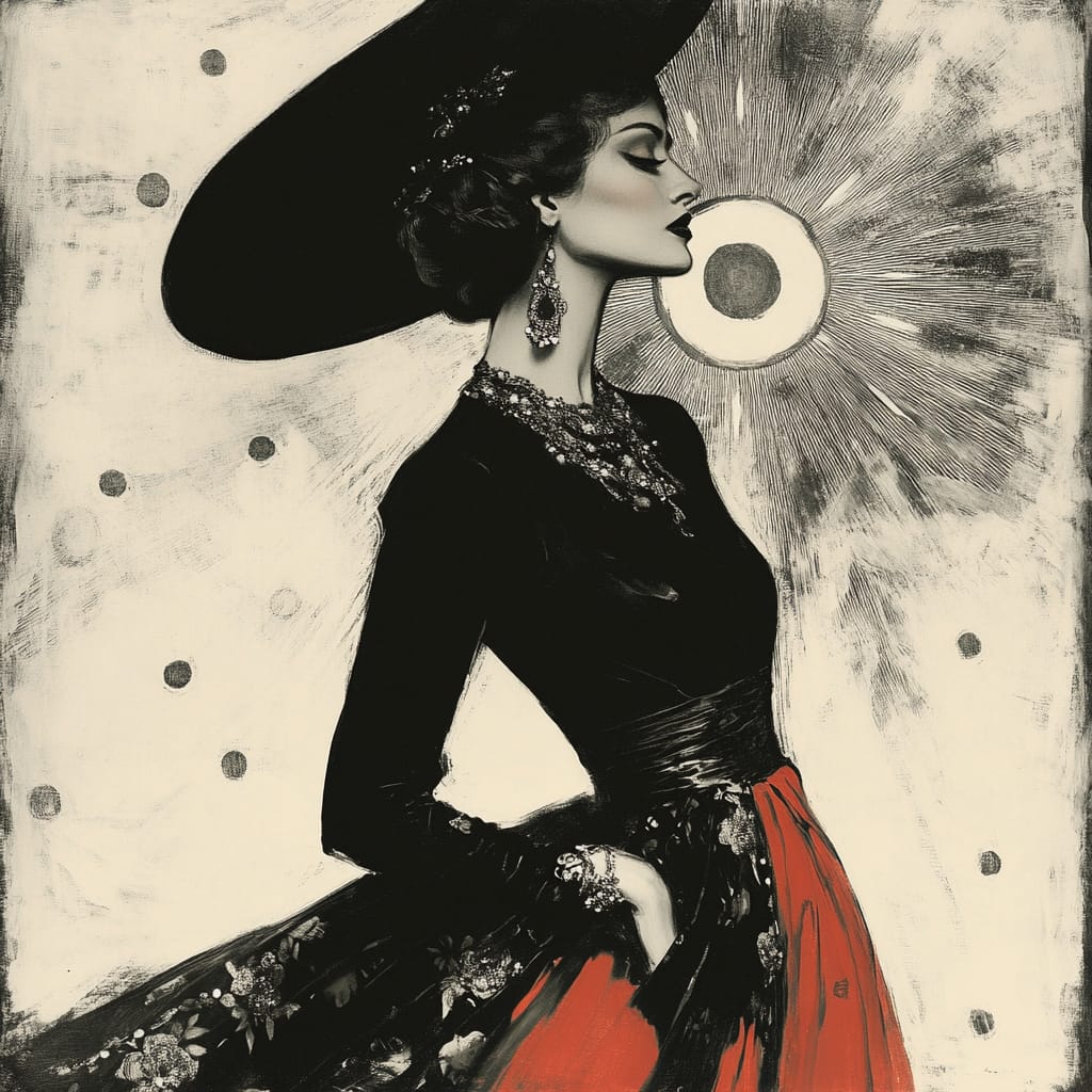 - fantasy fashion illustration, mystical accessories, elegant silhouette, vintage romantic style, glowing magical accents, editorial layout --sref 752314637 --stylize 200