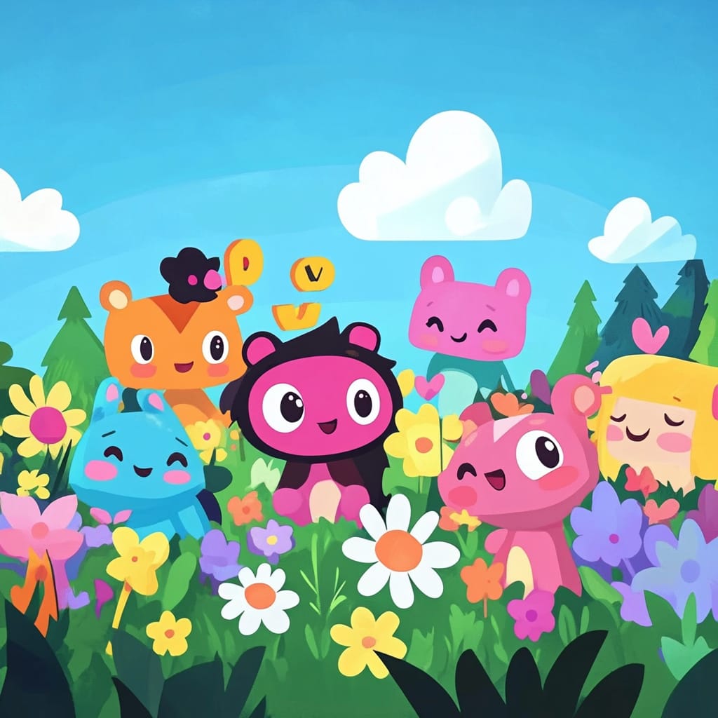 - A colorful alphabet meadow with hand-drawn animals interacting with glowing English letters, set under a vibrant blue sky --sref 895482257 --v 6.1 --stylize 200