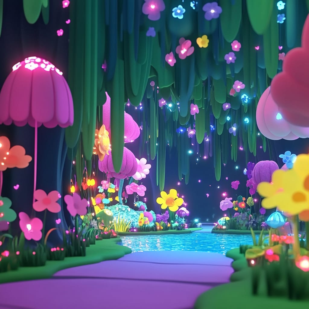 - A dreamlike glowing garden with colorful floral arches, radiant water features, and softly lit whimsical characters --sref 895482257 --v 6.1 --stylize 200