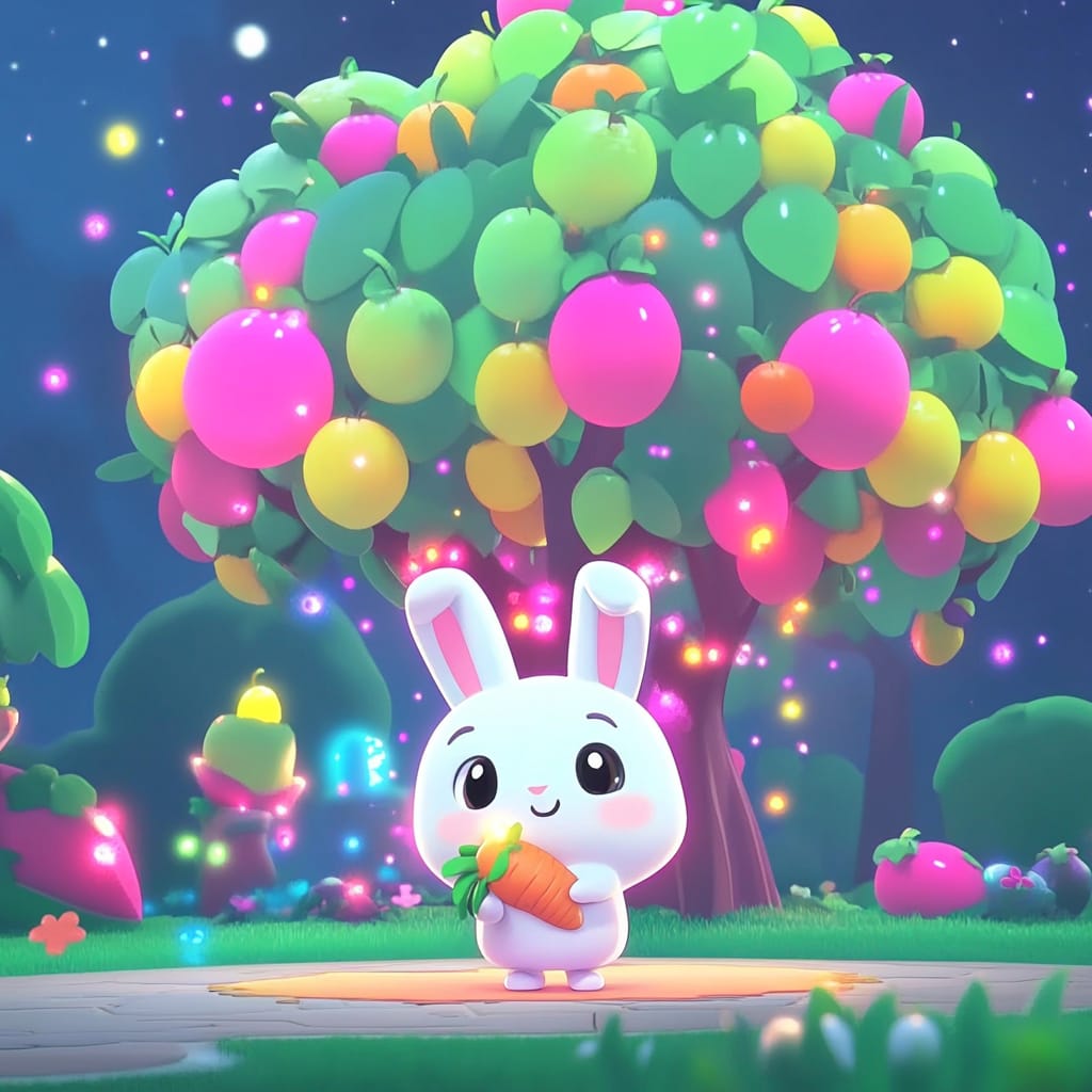 - A happy bunny holding a glowing carrot, standing under a colorful tree with oversized leaves and glowing fruits --sref 895482257 --v 6.1 --stylize 200