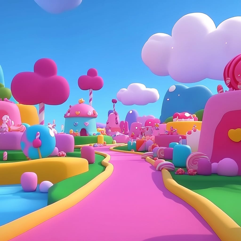- A glowing pastel candy world with colorful lollipops, swirling pathways, and a vibrant sky filled with playful cartoon clouds --sref 895482257 --v 6.1 --stylize 200