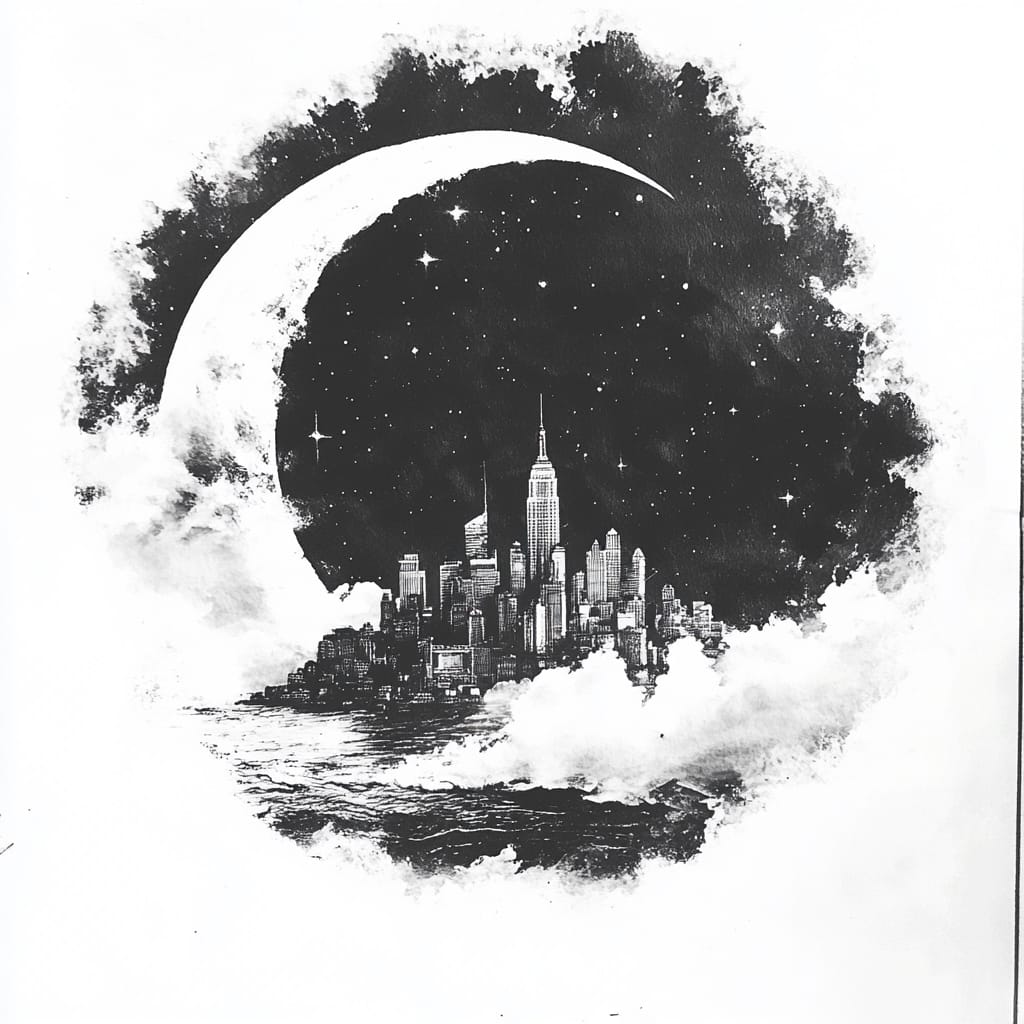 - An intricate composition of a crescent moon cradling a miniature city skyline. The moon's surface blends into clouds and waves, while faint stars scatter through the background, creating a delicate balance between celestial and earthly elements --sref 887303581 --stylize 200