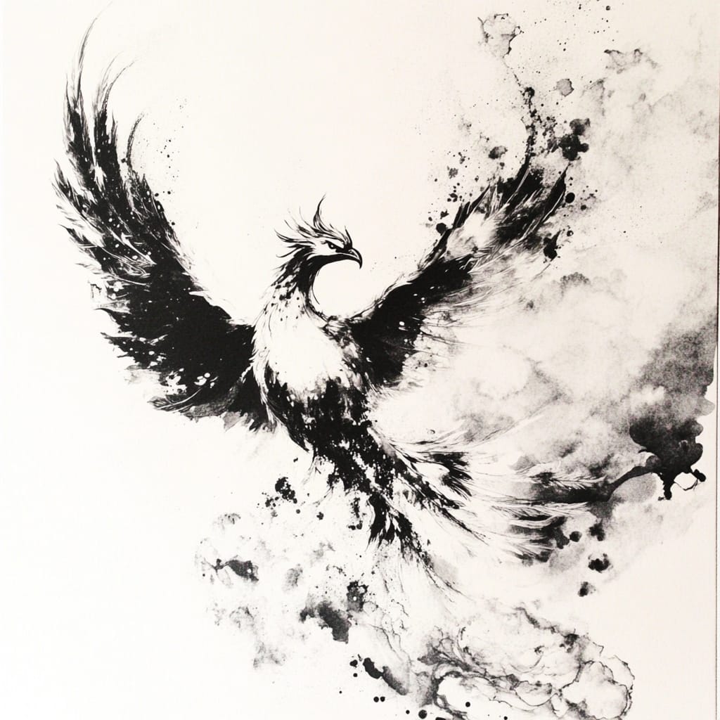 - An intricate depiction of a phoenix rising from an abstract pool of ink, its wings morphing into flowing rivers and fiery patterns. The background fades into soft gradients of swirling smoke and embers, creating a harmonious blend of boldness and subtlety --sref 887303581 --stylize 200
