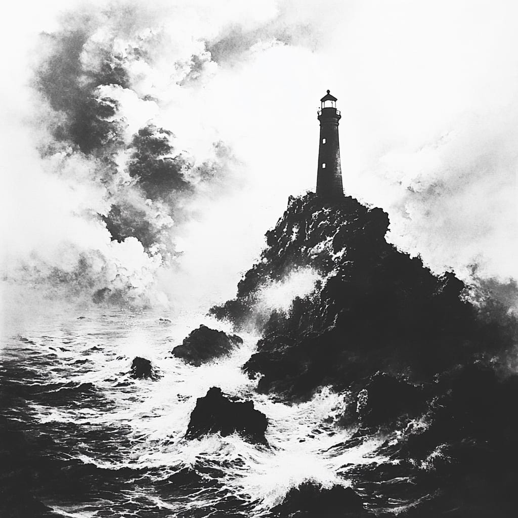 - A haunting landscape of a lone lighthouse standing atop jagged cliffs under a swirling, storm-filled sky. Waves crash violently below, and a mysterious light beam cuts through the darkness, illuminating faint silhouettes of distant ships lost in the mist --sref 887303581 --stylize 200