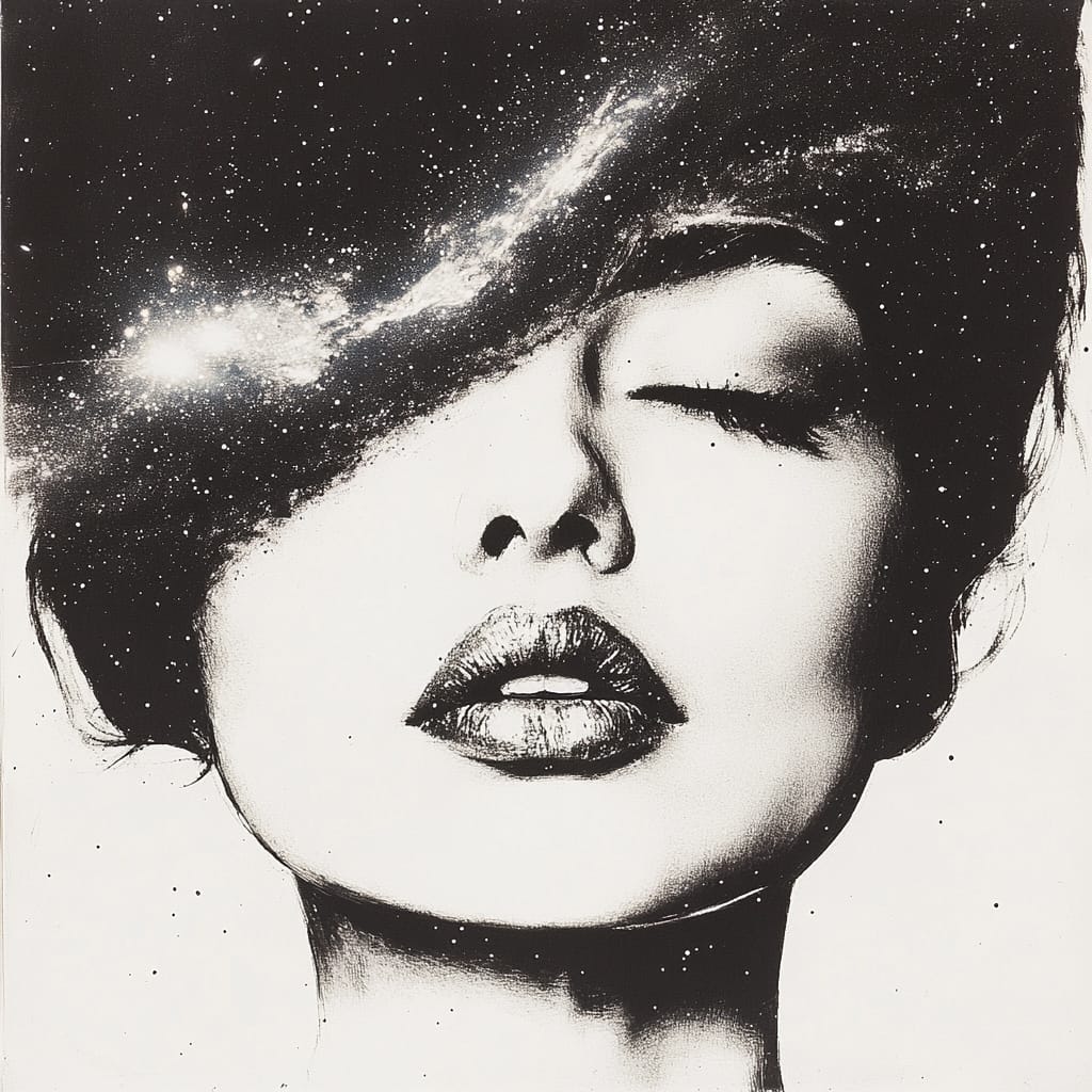 - A woman’s portrait seamlessly blended with a swirling galaxy. Her features emerge naturally from cosmic dust and starlight, with constellations shaping her eyes and lips, and flowing nebulae extending to form her hair, evoking a celestial and otherworldly beauty --sref 887303581 --stylize 200