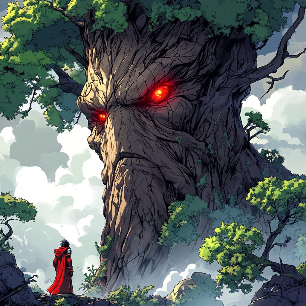 - A towering ancient treant with glowing red eyes, intricate bark textures forming facial features, surrounded by lush greenery and a dramatic cloudy sky, a lone figure in a red cloak standing below, emphasizing scale and tension, high-contrast lighting highlighting the tree's grandeur --sref 2001176435 --v 6.1 --stylize 200