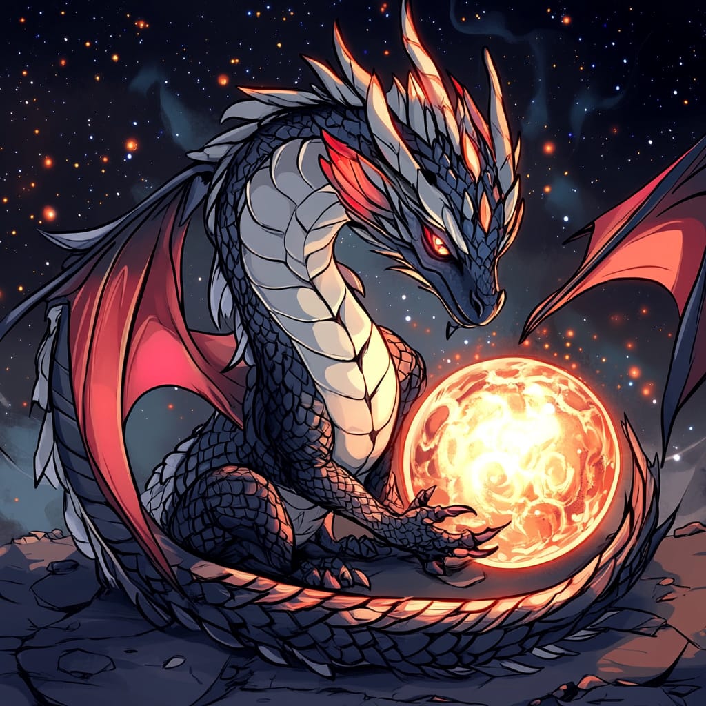 - A mystical dragon coiled around a glowing orb, its scales shimmering with iridescent colors, intricate patterns etched along its wings and tail, set against a starry celestial background with subtle nebula effects, emphasizing elegance and magical allure for collectible items --sref 2001176435 --v 6.1 --stylize 200