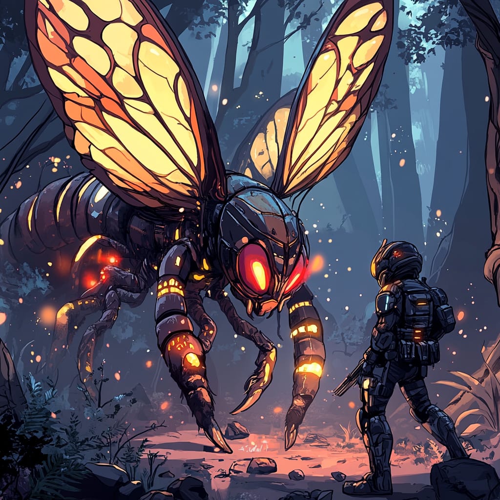 - A bioluminescent forest inhabited by towering insectoid creatures with iridescent wings and glowing markings, facing off against armored hunters wielding futuristic weapons, vibrant colors of the creatures contrasting with the cold metallic tones of the hunters' gear, emphasizing tension and contrast --sref 2001176435 --v 6.1 --stylize 200