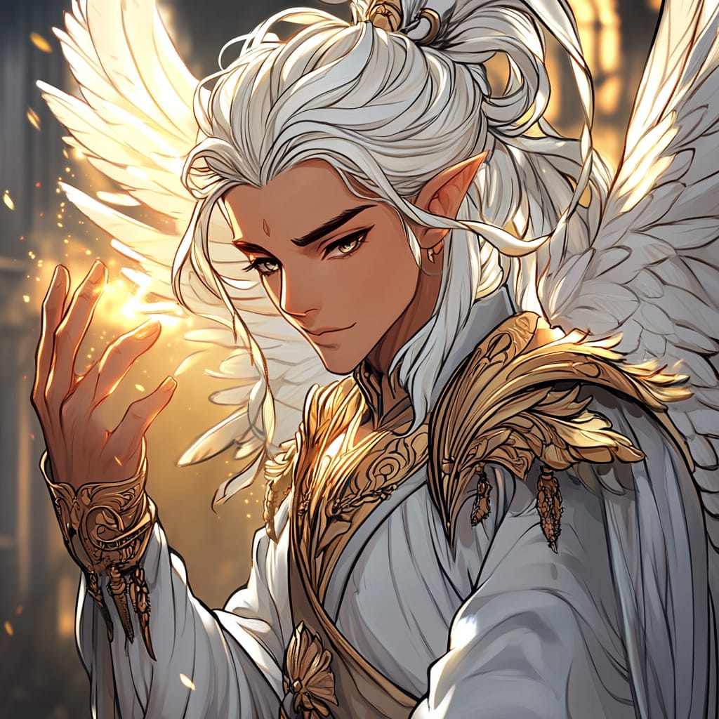 - A close-up of a celestial protector extending a glowing hand, their delicate yet strong fingers radiating divine energy, the intricate embroidery of their armor visible in stunning detail, their calm expression framed by cascading golden hair and softly glowing feathers, with a blurred, heavenly light in the background --sref 2001176435 --v 6.1 --stylize 200