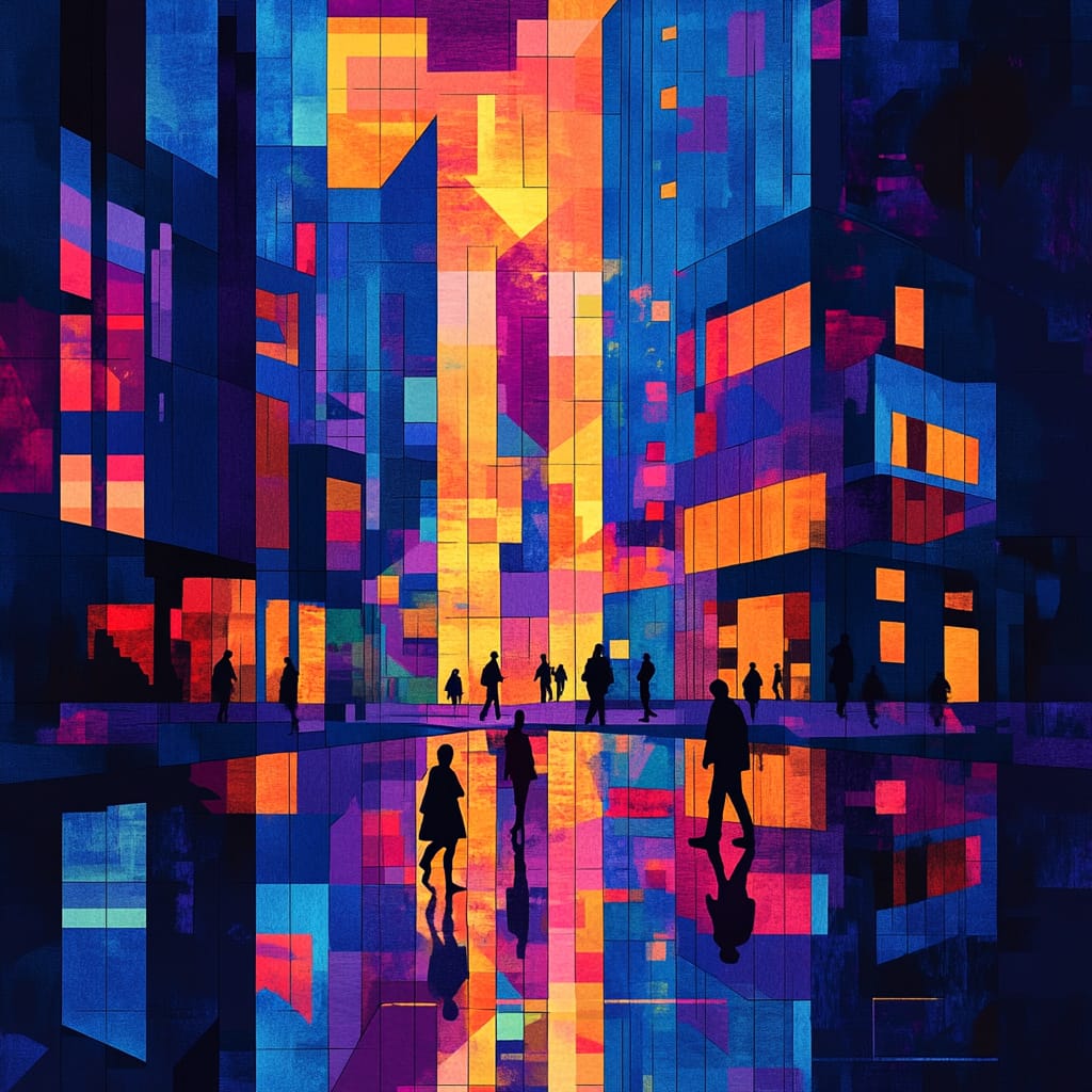 - futuristic cityscape at dusk, neon-lit buildings with geometric shapes, silhouettes of people walking, reflections in the glass facades, blending cool blues and warm pinks, abstract urban environment --sref 196436560 --v 6.1 --stylize 200