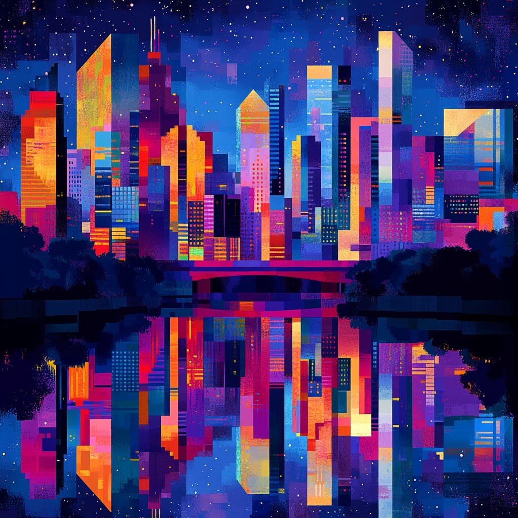- A vibrant city skyline under a clear night sky filled with stars. Skyscrapers with sharp, geometric facades glow with neon lights in shades of magenta, cyan, and gold. The reflections on a nearby river create dynamic symmetry, while faint silhouettes of trees and bridges add layers to the composition. The interplay of natural starlight and artificial city light creates a striking, futuristic atmosphere --sref 196436560 --v 6.1 --stylize 200