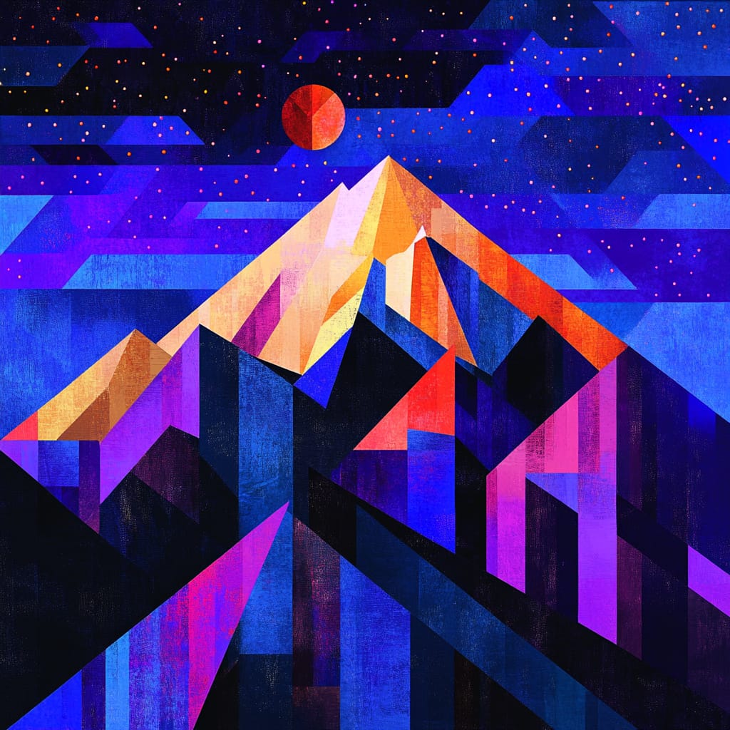 - A majestic mountain peak under a starry night sky, with a meteor shower streaking across. The rugged geometric layers of the mountain are highlighted by moonlight, creating sharp contrasts between warm earthy tones and cool, shadowed blues. The sky features vibrant gradients of deep indigos and subtle purples, punctuated by glowing stars. The interplay of celestial motion and grounded solidity gives the scene a tranquil yet dynamic feel --sref 196436560 --v 6.1 --stylize 200