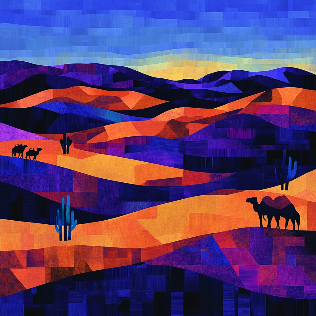 - An expansive desert landscape at sunset, with sand dunes forming smooth, curved geometric patterns. The sky transitions from golden yellows to deep purples, casting long shadows across the dunes. Small silhouettes of cacti and desert flora add detail to the scene, while the warm tones of the sand contrast vividly with the cool shadows and sky. A distant caravan of camels provides movement, blending seamlessly with the serene atmosphere --sref 196436560 --v 6.1 --stylize 200