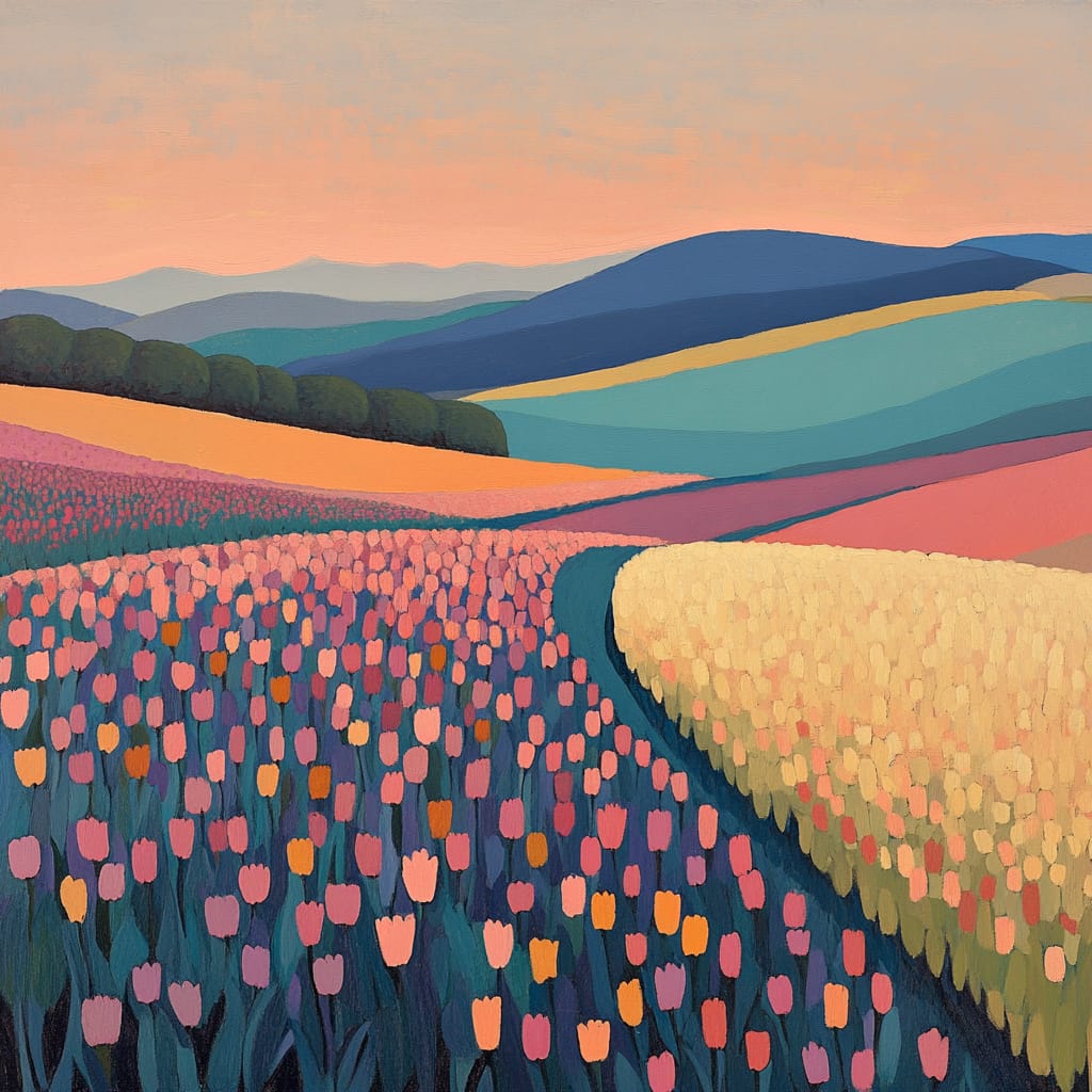 - A vast field of blooming flowers in soft shades of coral, pink, and golden yellow, illuminated by the gentle light of a rising sun. Rows of flowers stretch into the distance, blending seamlessly with the rolling teal hills and a soft, gradient sky of lavender and peach. The composition emphasizes balance, warmth, and natural beauty --sref 265794844 --v 6.1 --stylize 200