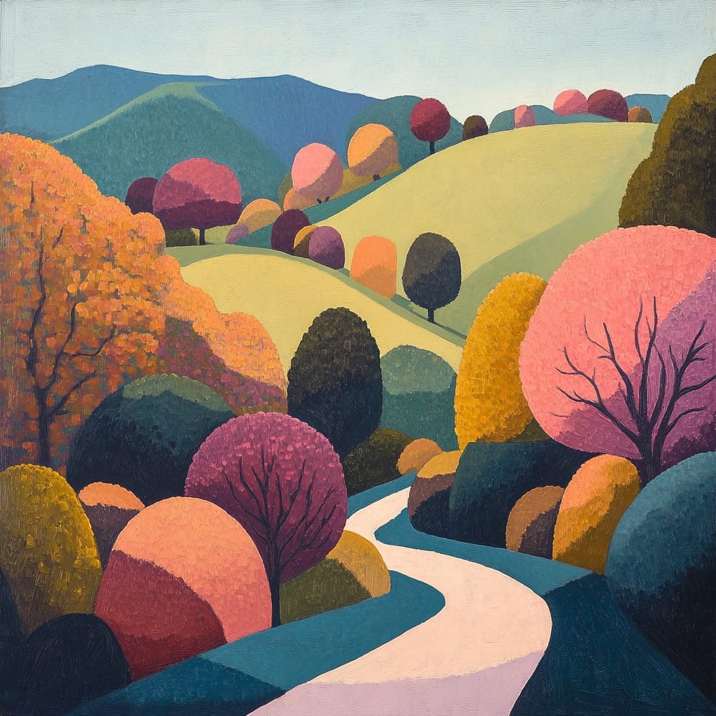 - A winding path leading through vibrant, stylized hills covered in geometric bushes and trees in shades of pink, orange, and soft yellow. The scene is illuminated by a gentle morning glow, with muted green and teal tones creating depth. The composition emphasizes harmony between organic forms and geometric simplicity. --sref 265794844 --v 6.1 --stylize 200