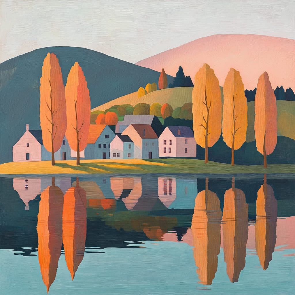 - A charming village nestled on a small island in the center of a calm, reflective lake. The pastel-colored houses are surrounded by tall, slender trees in shades of orange, pink, and yellow. The distant hills and gradient sky of soft peach and blue add depth and serenity to the idyllic scene --sref 265794844 --v 6.1 --stylize 200