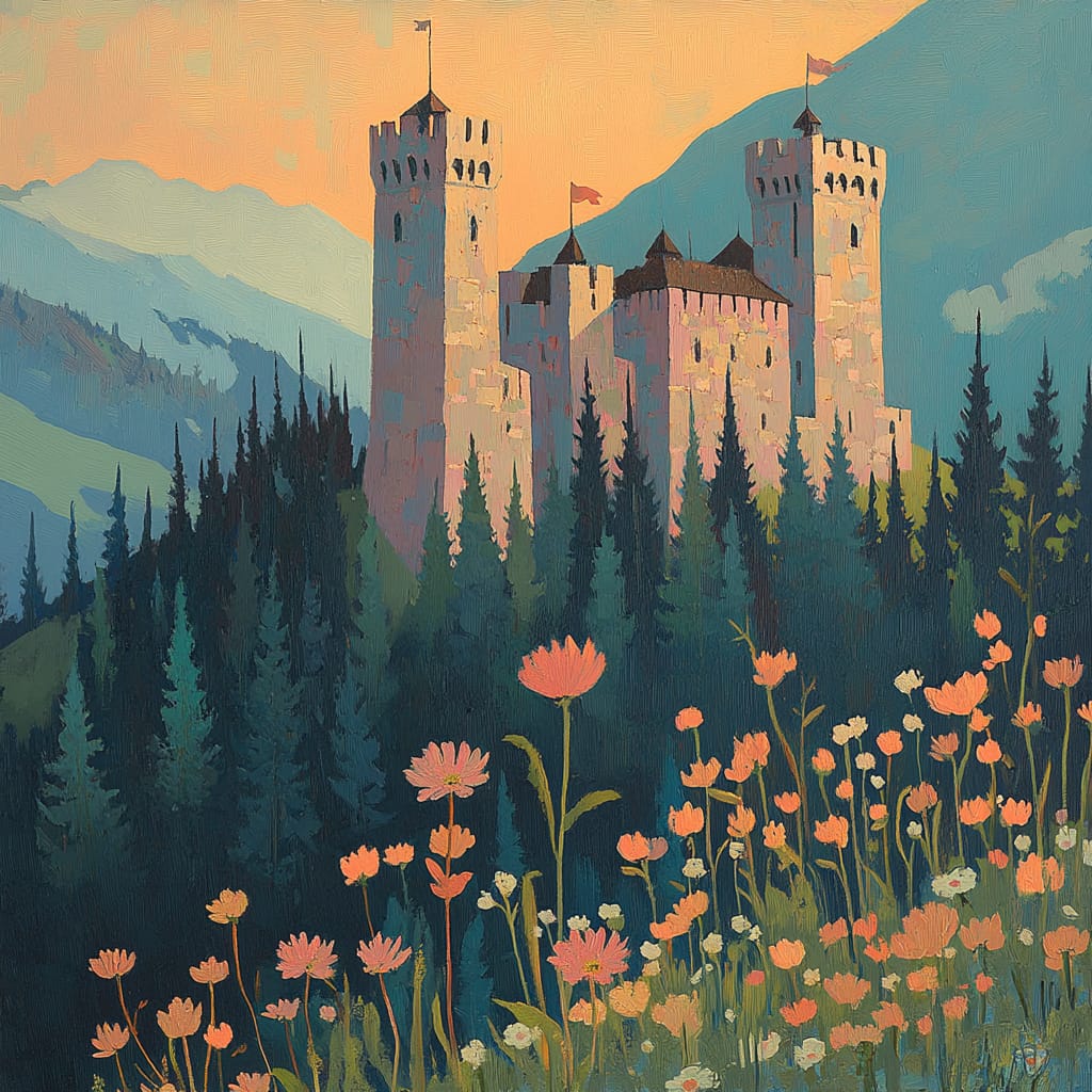 - A majestic stone castle nestled among dense pine forests on a mountain peak, its walls glowing softly in the warm light of the sunset. The background features rolling teal hills fading into mist, while the foreground is decorated with blooming wildflowers in coral and peach tones, creating a scene of mystery and elegance --sref 265794844 --v 6.1 --stylize 200