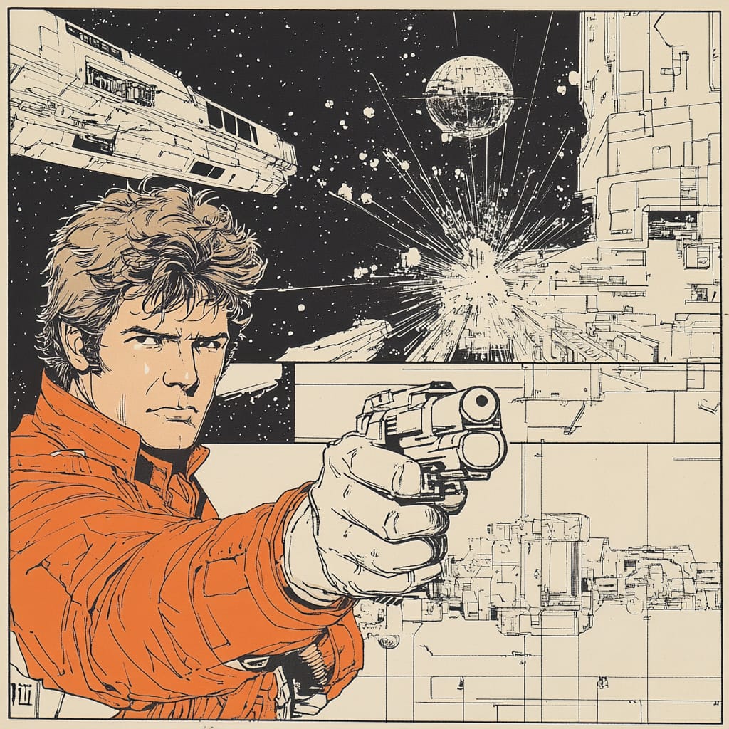 - A comic book page with panels of an action scene featuring Han Solo in the style of Moebius, pen and ink drawing by Moebious, line art in multiple colors, highly detailed --sref 537321771 --v 6.1 --stylize 200