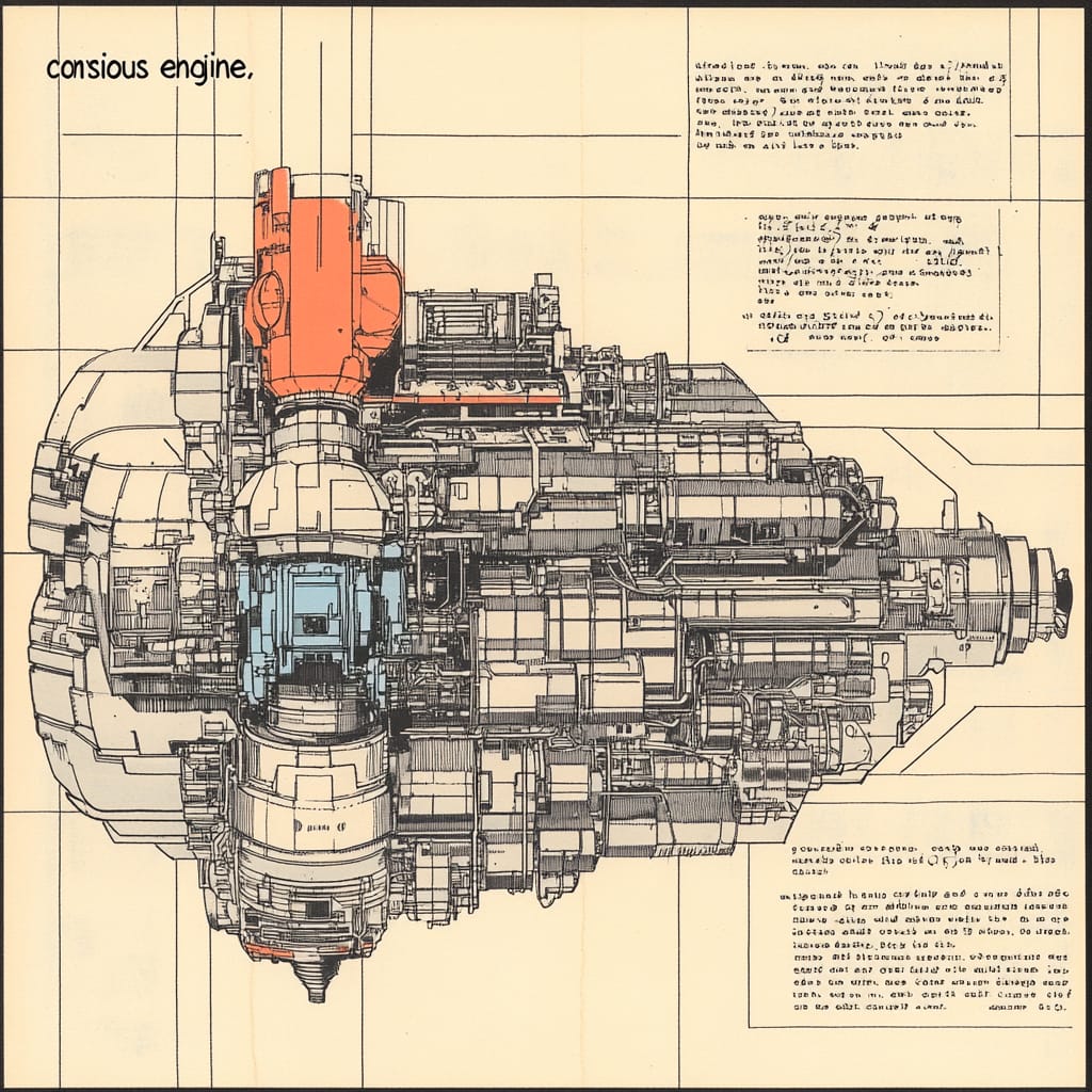 - A fictional technical manual page for a "conscious engine," illustrated with exploded diagrams, layered schematics, and annotations in an invented script, combining vintage engineering book aesthetics with surreal sci-fi elements, printed in black, red, and muted blue inks on aged paper, displayed like a relic from an alternate industrial history --sref 537321771 --v 6.1 --stylize 200